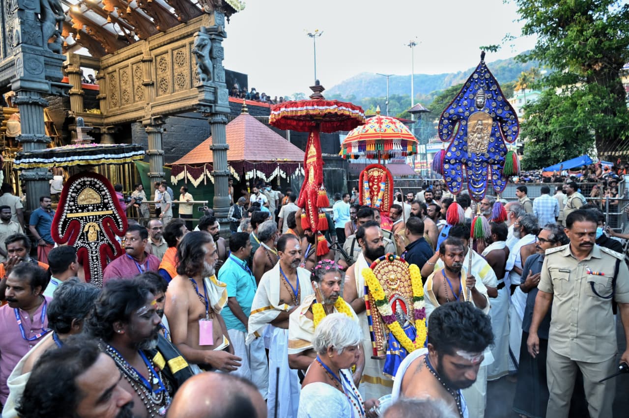 അയ്യപ്പസ്വാമിയുടെ പിതൃസ്ഥാനീയരായി കരുതപ്പെടുന്ന ആലങ്ങാട് സംഘത്തിന്റെ കര്പ്പൂര താലം എഴുന്നള്ളത്തും സന്നിധാനത്ത് നടന്നു. പെരിയോന് പ്രദീപ് ആര് മേനോന് സ്വാമിയുടെ നേതൃത്വത്തില് അയ്യപ്പനെ ഭജിച്ച് നീങ്ങിയ സംഘം ഭക്തിയുടെ നിറവില് ചുവടുവച്ചു. മാളികപ്പുറത്ത് മണിമണ്ഡപത്തില് നിന്നും പൂജിച്ച് വാങ്ങിയ ഗോളകയും കൊടിക്കൂറയും തിരുവാഭരണത്തോടൊപ്പം എത്തിയ തിടമ്പും ചാര്ത്തിയാണ് കര്പ്പൂര താലം എഴുന്നളളിയത്.