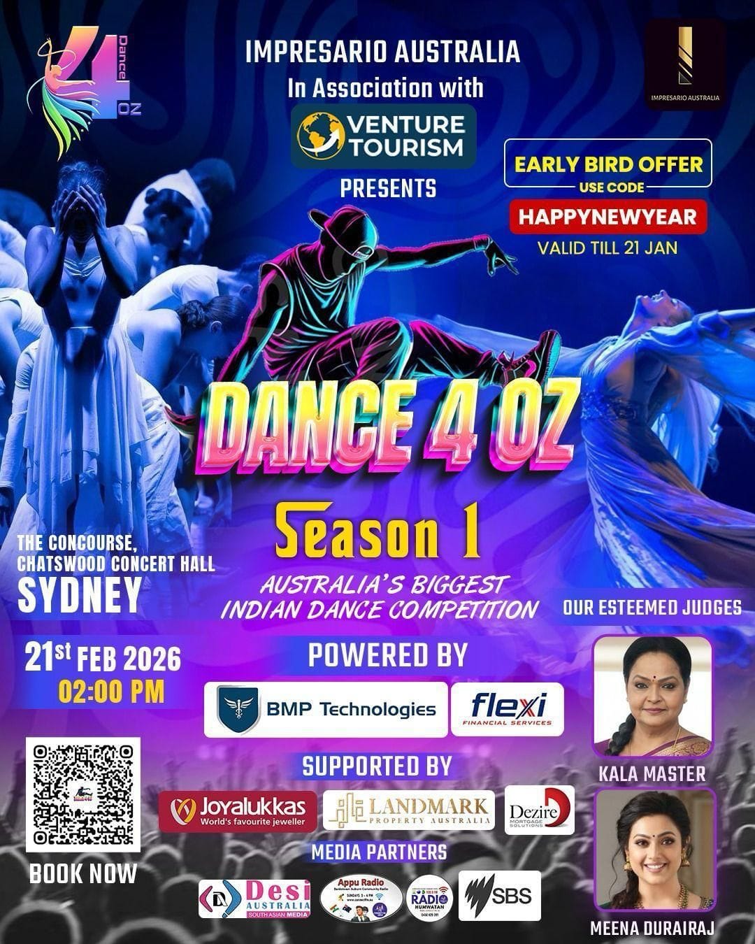 സിഡ്നിയിലെ നൃത്തപ്രേമികൾക്ക് ആവേശം പകരാൻ ‘ഡാൻസ് 4 ഓസ്’ സീസൺ 1 എത്തുന്നു. പ്രശസ്ത നൃത്തസംവിധായിക കല മാസ്റ്ററും, പ്രിയ നടി മീനയുമാണ് ഈ വിപുലമായ മത്സരത്തിന് വിധികർത്താക്കളായി എത്തുന്നത്. ഇന്ത്യയുടെ ഊർജ്ജസ്വലമായ നൃത്തരൂപങ്ങളെ ഓസ്ട്രേലിയൻ മണ്ണിൽ ഒരൊറ്റ വേദിയിൽ അണിനിരത്തുന്ന ഈ പരിപാടി ഒരു നൃത്ത മത്സരത്തിനപ്പുറം കലയുടെ ഒരു വലിയ പ്രസ്ഥാനമായി മാറും.