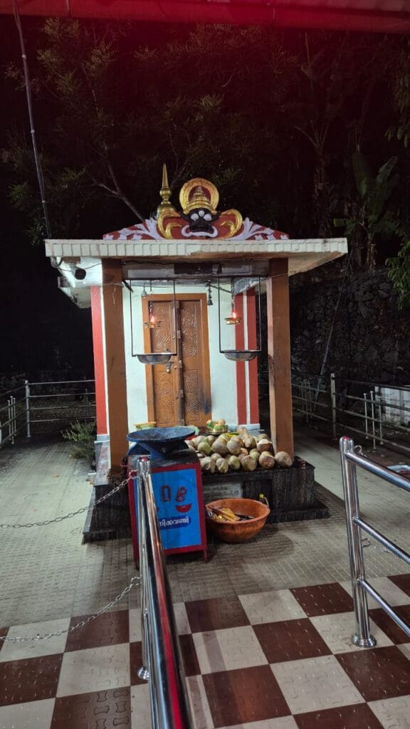 അടയാണ് ഇവിടുത്തെ പ്രധാന നൈവേദ്യം. കരിക്ക്, വെറ്റ പാക്ക് എന്നിവ താലത്തിലാക്കി ‘കുടിക്കാൻ കൊടുക്കൽ’ എന്നൊരു വഴിപാടുമുണ്ട്. പീഠത്തിലുള്ള ഒരു പ്രതിഷ്ഠ മാത്രമേ ഉള്ളിലുള്ളു. കീഴ്ശാന്തി നടത്തുന്ന മുക്കാൽ മണിക്കൂർ പൂജയ്ക്ക് ശേഷം നടയടക്കും.ഭക്തർക്ക് , നേദിച്ച വഴിപാടിന്റെ വിതരണവുമുണ്ട്.