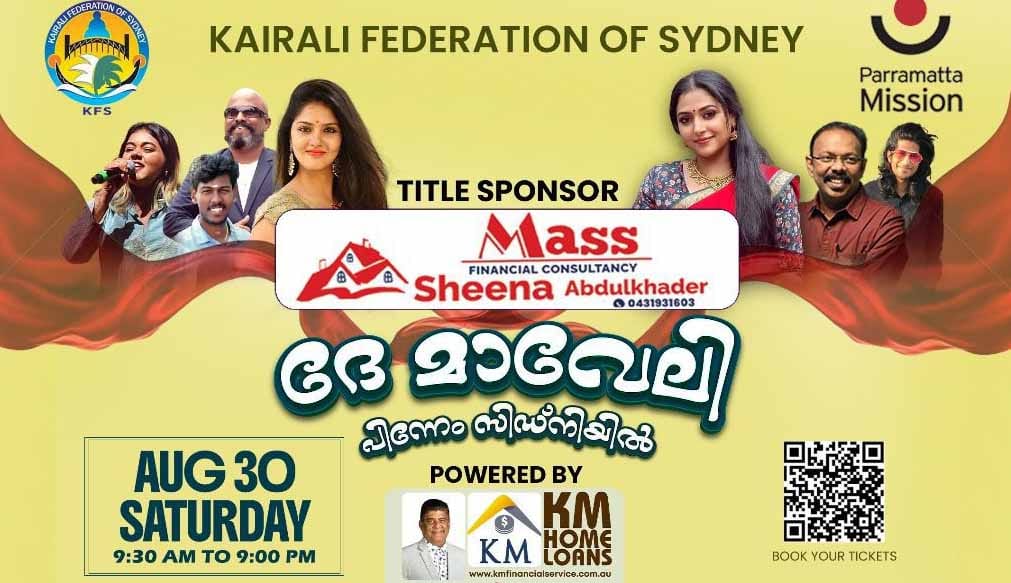 സിഡ്നി: കൈരളി ഫെഡറേഷന് ഓഫ് സിഡ്നിയുടെ മെഗാ ഓണം ഷോ ‘ദേ മാവേലി പിന്നേം സിഡ്നിയില്’ ഓഗസ്റ്റ് 30 ശനിയാഴ്ച. പരിപാടിയുടെ നടത്തിപ്പിനായി അതിവിപുലമായ ക്രമീകരണങ്ങളാണ് ചെയ്തിരിക്കുന്നതെന്ന് സംഘാടകര് അറിയിച്ചു. പ്ലംപ്റ്റനിലെ സെന്റ് സ്റ്റീഫന്സ് ഹാളാണ് മെഗാ ഷോയുടെ വേദിയായി മാറുന്നത്.