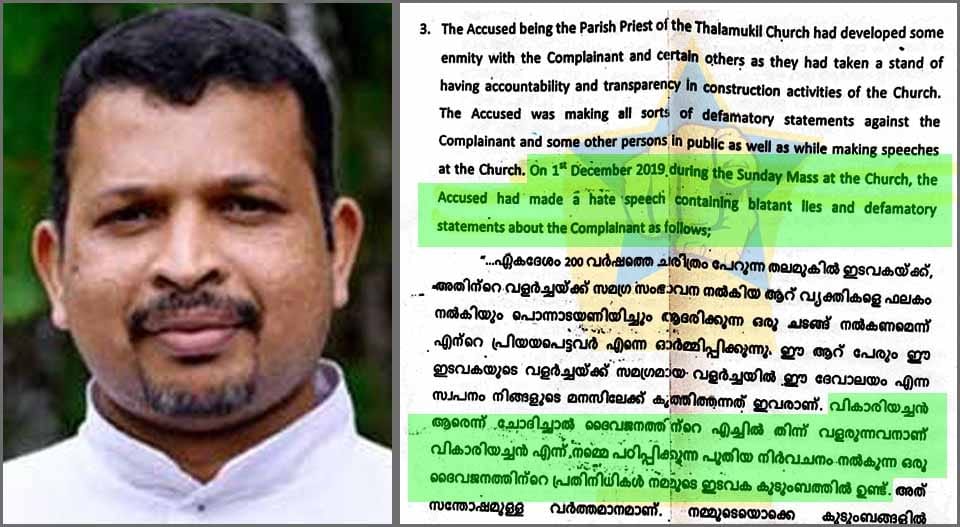 പള്ളിയുടെ നിര്‍മാണ കാര്യത്തിലെ സുതാര്യതയില്ലായ്മയെ ചോദ്യം ചെയ്ത് കണക്കു ചോദിച്ചതിനാണ് ഇടവകാംഗങ്ങളായ ആറു പേരെ വികാരി കുര്‍ബാന മധ്യേയുള്ള പ്രസംഗത്തില്‍ അതിരൂക്ഷ ഭാഷയില്‍ തേജോവധം ചെയ്തത്. ഈ പരാമര്‍ശത്തിന് ഇരയായ ജോസ് വര്‍ഗീസ്, ബ്രൂണോ ജാക്‌സന്‍ എന്നിവരാണ് അഡ്വ. ബോറിസ് പോള്‍ മുഖേന പരാതിയുമായി കോടതിയിലെത്തിയത്. 2019 ഡിസംബര്‍ ഒന്നിനു കുര്‍ബാന മധ്യേ വികാരി ഫാ. ജോസഫ് കടവില്‍ നടത്തിയ പ്രസംഗം തങ്ങള്‍ക്ക് മാനഹാനിയുണ്ടാക്കിയതായി ഇരുവരും കോടതിയില്‍ ബോധിപ്പിച്ചു. ഈ വാദം ശരിയെന്നു കണ്ടെത്തിയതിനെ തുടര്‍ന്നാണ് രണ്ടു പേര്‍ക്കും നഷ്ടപരിഹാരമായി ഓരോ ലക്ഷം രൂപ വീതവും കോടതിച്ചെലവായി 75000 രൂപ വീതവും നല്‍കാന്‍ വിധിച്ചത്.