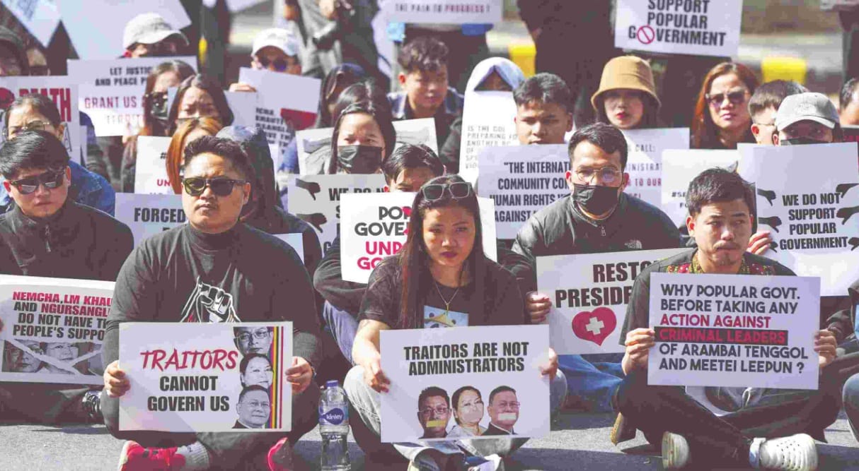 വൈ. ഖേംചന്ദിന്റെ നേതൃത്വത്തിലുള്ള സർക്കാരിൽ കുക്കി വനിതാ നേതാവ് നെംച കിപ്ജെൻ ഉപമുഖ്യമന്ത്രിയായി ചേർന്നതും എംഎൽഎമാരായ എൽ.എം. ഖൗട്ടെയും എൻ. സനേറ്റും സർക്കാരിനെ പിന്തുണയ്ക്കാൻ തീരുമാനിച്ചതുമാണു പ്രതിഷേധം ക്ഷണിച്ചുവരുത്തിയത്. ഇതേത്തുടർന്ന് പലയിടങ്ങളിലും നടന്ന പ്രതിഷേധം അക്രമത്തിലേക്കു വഴിമാറുകയായിരുന്നു.