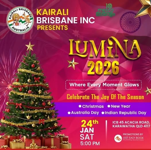 ബ്രീസ്ബെയ്ന്: ഓസ്ട്രേലിയയിലെ മലയാളി കൂട്ടായ്മകളില് പ്രമുഖരായ കൈരളി ബ്രീസ്ബെയ്ന് (K airali Bri-sbane Inc) സംഘടിപ്പിക്കുന്ന ഈ വര്ഷത്തെ ഏറ്റവും വലിയ ആഘോഷമാമാങ്കം ‘ലൂമിന 2026’ (Lum-in-a 2026) അണിയറയില് ഒരുങ്ങുന്നു. Chritsmas, New Year, Autsralia Day, Indian Republic Day സംയുക്ത ആഘോഷമായാണ് ‘ലൂമിന’ അരങ്ങേറുന്നത്.ജനുവരി 24-ന് വൈകുന്നേരം 5 മണി മുതല് കാരവത്തയിലെ ഐ.സി.ബി ഹാളില് (I-CB, Kar-awath-a) വെച്ചാണ് പരിപാടികള് നടക്കുക.