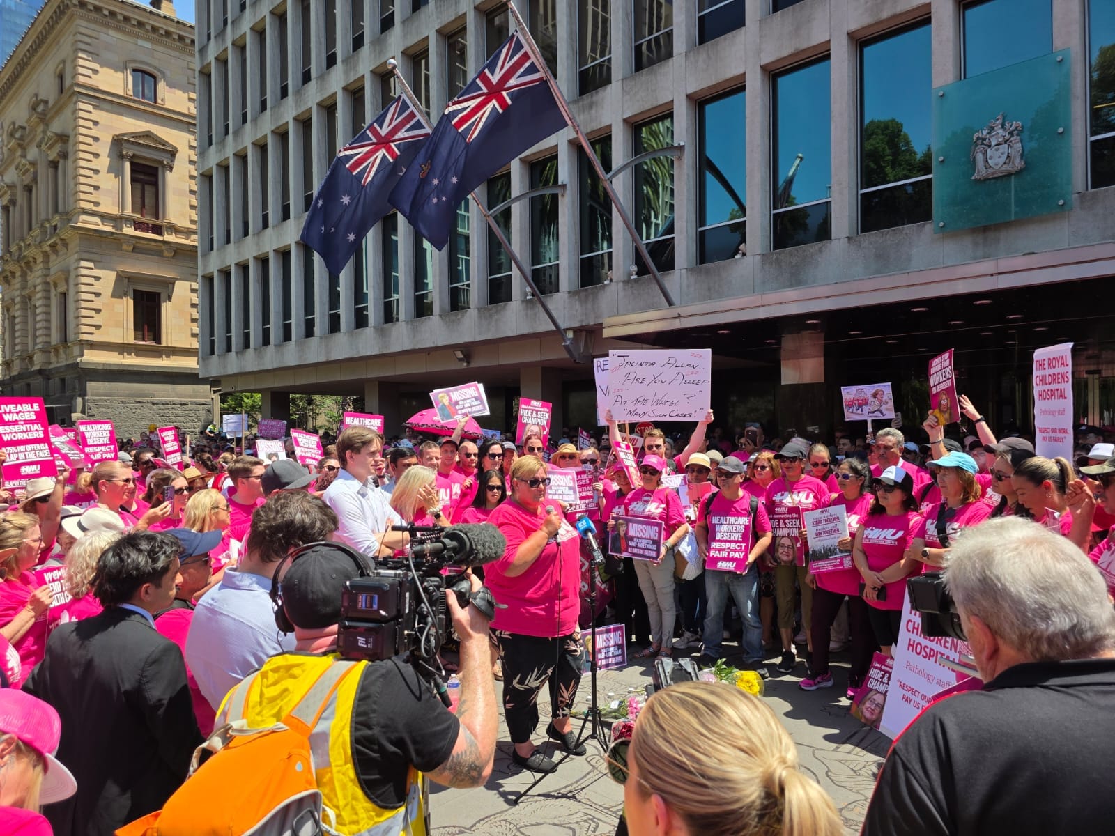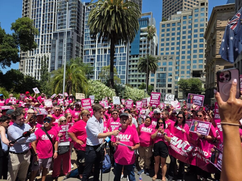 HWU നേതാവ് ജെയ്ക് – മക്- ഗിന്നസിൻ്റെ നേതൃത്വത്തിൽ നടന്ന പ്രതിഷേധ റാലി വിക്ടോറിയൻ ട്രേഡ് ഹാളിന് മുൻപിൽ നിന്ന് ആരംഭിച്ച് പാർലമെൻ്റ് വഴി പ്രീമിയർ ജസീന്ത അലൻ്റെ സ്വകാര്യ ഓഫീസിന് മുൻപിൽ സമാപിച്ചു. റൂറൽ ഏരിയകളിൽ നിന്നെത്തിയ വിവിധ യൂണിയൻ ഭാരവാഹികൾ സമരത്തെ അഭിസംബധോന ചെയ്തു.മികച്ച വേതനം ഉറപ്പാക്കുക ജോലി ഭാരം ആനുപാതികമായി തിട്ടപ്പെടുത്തുക, ഒഴിഞ്ഞ തസ്തികകളിൽ നിയമനങ്ങൾ നടത്തുക, തുടങ്ങി എൺപതോളം ആവശ്യങ്ങളാണ് HWU മുന്നോട്ടു വെച്ചിട്ടുള്ളത്.വരും ദിവസങ്ങളിൽ സമരം കൂടുതൽ ശക്തമാക്കുമെന്ന മുന്നറിയിപ്പും നേതാക്കൾ പ്രതിഷേധ മാർച്ചിനു ശേഷം അറിയിച്ചു.ഓസ്ട്രേലിയയിലെ ആരോഗ്യ മേഖലകളിൽ ജോലിയെടുക്കുന്ന മലയാളികൾ ഏറെയാണ്.