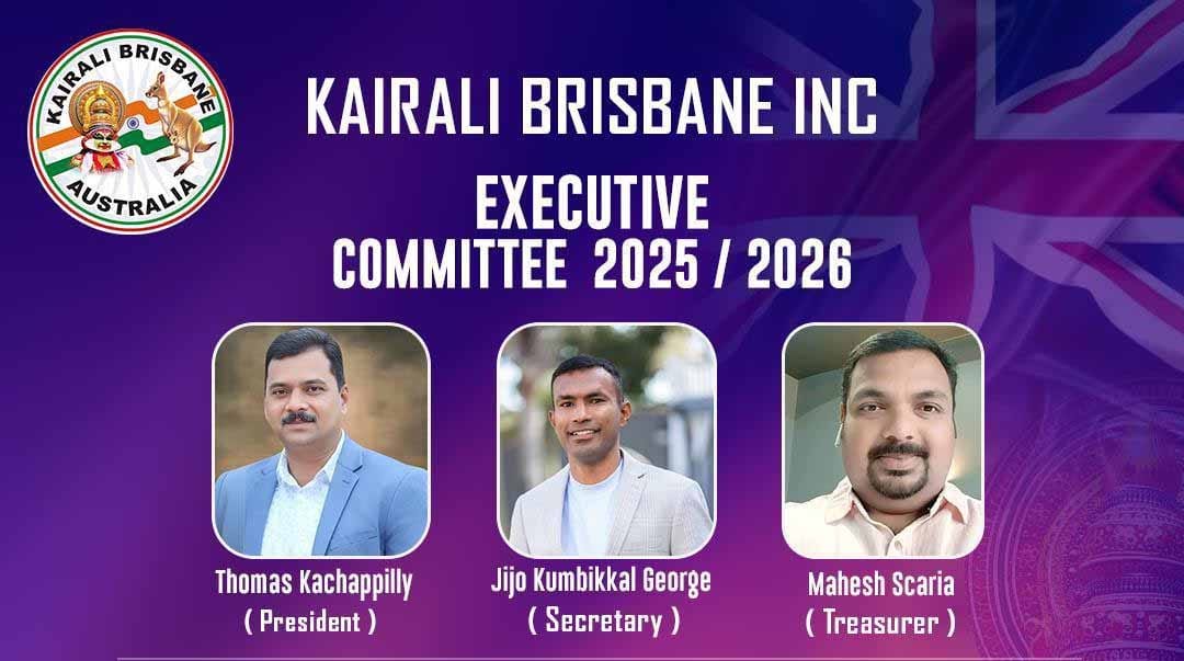 ബ്രിസ്‌ബേന്‍: ബ്രിസ്‌ബേനിലെ മലയാളി കൂട്ടായ്മയായ കൈരളി ബ്രിസ്‌ബേന്റെ 2025-26 വര്‍ഷത്തെ ഭാരവാഹികളായി തോമസ് കാച്ചപ്പിള്ളി-പ്രസിഡന്റ്, ജിജോ കുമ്പിക്കല്‍ ജോര്‍ജ്-സെക്രട്ടറി, മഹേഷ് സ്‌കറിയ-ട്രഷറര്‍ എന്നിവരെ തിരഞ്ഞെടുത്തു.