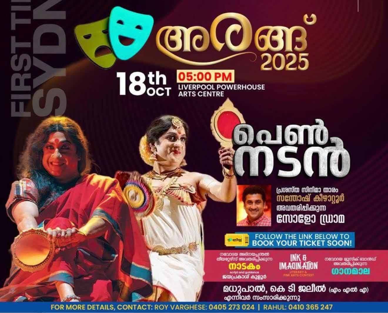 സിഡ്‌നി: പ്രശസ്ത സിനിമാ താരം സന്തോഷ് കീഴാറ്റൂരിന്റെ സോളോ ഡ്രാമ പെണ്‍നടന്‍ ഇന്ന് സിഡ്‌നിയില്‍ അരങ്ങിലെത്തുന്നു. വൈകുന്നേരം അഞ്ചിന് ലിവര്‍പൂള്‍ പവര്‍ഹൗസ് ആര്‍ട്‌സ് സെന്ററിലാണ് സോളോ ഡ്രാമയുടെ അവതരണം നടക്കുക. കൂടുതല്‍ വിവരങ്ങള്‍ക്ക് ബന്ധപ്പെടുക