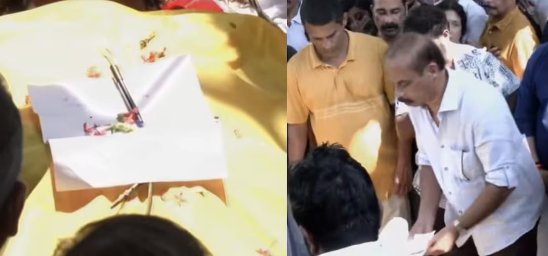 അന്ത്യസമ്മാനമായി ശ്രീനിവാസന് ഇതിലും മനോഹരമായത് മറ്റെന്ത് നല്കാന്. ശ്രീനിവാസന് ഉപയോഗിച്ച പേനകൊണ്ട് സത്യന് അന്തിക്കാട് എഴുതി.. എന്നും എല്ലാവര്ക്കും നന്മകള് മാത്രം വരട്ടെ. മകന് ധ്യാനിന്റെ ആവശ്യപ്രകാരമായിരുന്നു ഇത്. ആ കടലാസും പേനയും മകന് ധ്യാനാണ് സത്യന് അന്തിക്കാടിന് കൈമാറിയതും ചിതയില് വെക്കാന് ആവശ്യപ്പെട്ടതും. ധ്യാനിന്റെ ആവശ്യപ്രകാരം ശ്രീനിവാസന്റെ ഭൗതികശരീരത്തിന് മുകളില് കടലാസും പേനും വെച്ച സത്യന് അന്തിക്കാട്, പൂക്കള് സമര്പ്പിച്ച് പ്രാര്ഥിച്ചു. അഗ്നിപകരുന്നതിന് മുമ്പാണ് ശ്രീനിവാസന്റെ ഭൗതികശരീരത്തിന് അരികിലേക്ക് ധ്യാന് എത്തിയത്. തുടര്ന്ന് ഭൗതികശരീരത്തില് സ്പര്ശിച്ച ശേഷം ധ്യാന് മുഷ്ടി ചുരുട്ടി പിതാവിന് അഭിവാദ്യം നല്കി.