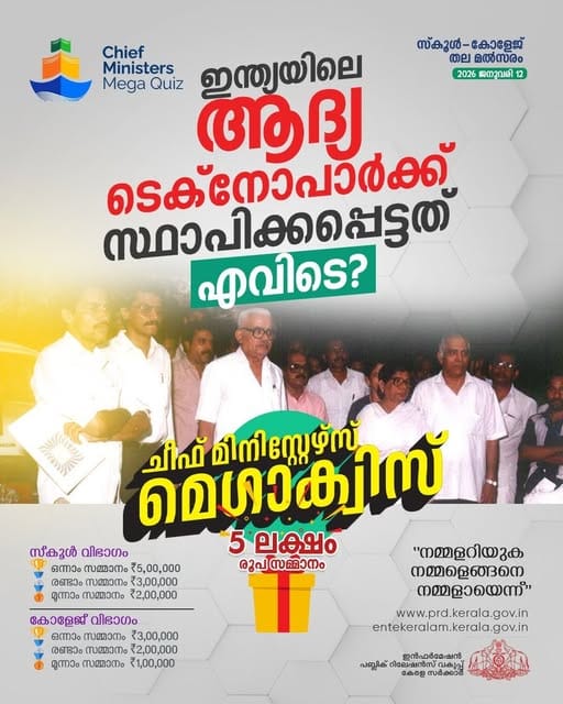 കേരളത്തിന്റെ സാമൂഹിക പുരോഗതിയുടെ ചരിത്രത്തെ അടിസ്ഥാനപ്പെടുത്തിയുള്ള വിജ്ഞാന യാത്ര-ചീഫ് മിനിസ്റ്റേഴ്സ് മെഗാക്വിസ് മത്സരം സംസ്ഥാനവ്യാപകമായി ആരംഭിക്കുകയാണ്. സംസ്ഥാനത്തുള്ള 8 മുതല് 12 വരെ ക്ലാസുകളിലുള്ള വിദ്യാര്ത്ഥികള്ക്കും സര്വകലാശാല, കോളേജ് വിദ്യാര്ത്ഥികള്ക്കും പ്രത്യേകം മത്സരങ്ങളാണ് നടത്തുന്നത്. സ്കൂള് തല മത്സര വിജയികള്ക്ക് ഒന്നാം സമ്മാനമായി അഞ്ച് ലക്ഷം രൂപയും രണ്ടാം സമ്മാനമായി മൂന്ന് ലക്ഷം രൂപയും മൂന്നാം സമ്മാനമായി രണ്ട് ലക്ഷം രൂപയും ലഭിക്കും. കോളേജ് തല മത്സര വിജയികള്ക്ക് ഒന്നാം സമ്മാനമായി മൂന്ന് ലക്ഷം രൂപയും രണ്ടാം സമ്മാനമായി രണ്ട് ലക്ഷം രൂപയും മൂന്നാം സമ്മാനമായി ഒരു ലക്ഷം രൂപയും സമ്മാനമായി നല്കും. മെമന്റോ, പ്രശസ്തി പത്രം എന്നിവയും വിജയികള്ക്ക് ലഭിക്കും.