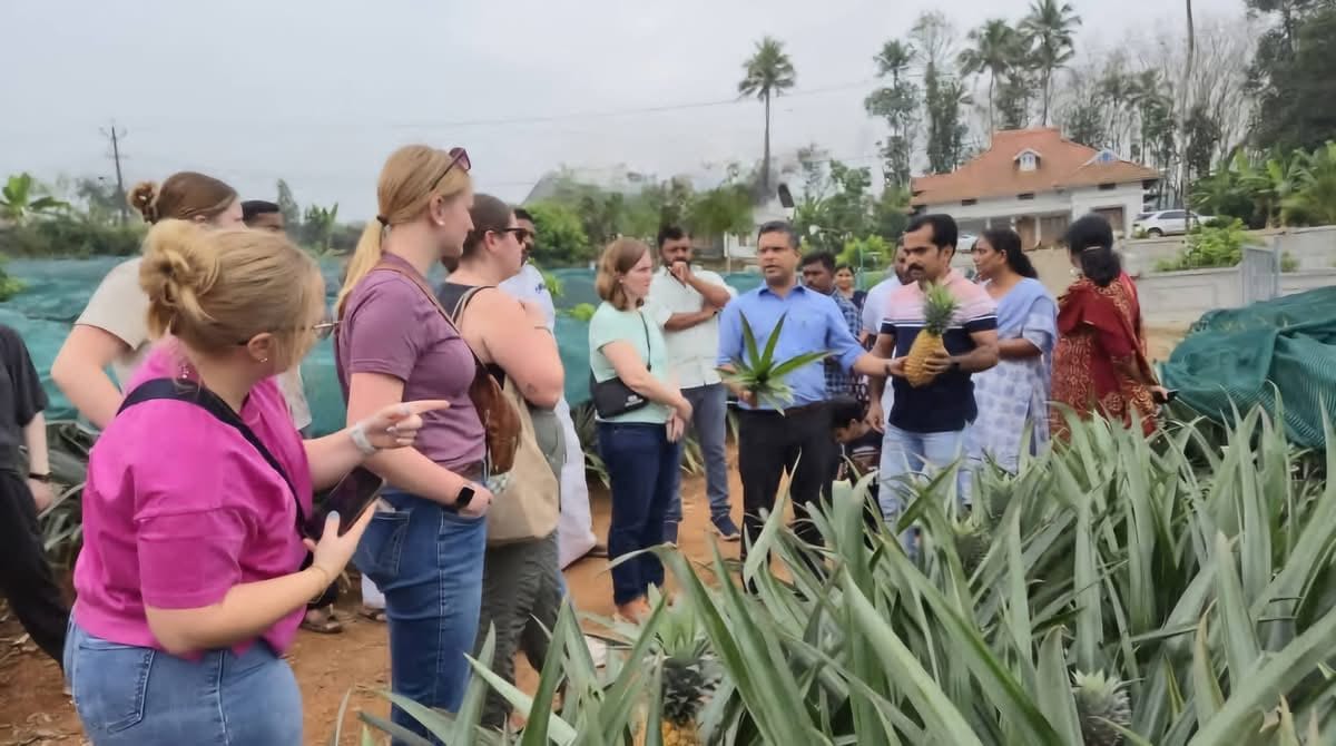 കൃഷിരീതിയും,വിളവെടുപ്പ് രീതിയും,ഗവണ്മെന്റിന്റെ പിന്തുണയും ചോദിച്ചറിഞ്ഞും, പൈനാപ്പിള് രുചിച്ചറിഞ്ഞും ആദ്യമായി ഇന്ത്യയില് എത്തിയ വിദ്യാര്ത്ഥികള് കൗതകത്തോടെ പഠനയാത്ര ആസ്വദിച്ചു.വാര്ഡ് മെമ്പര് ഷിവാഗേ തോമസ് ,കൃഷി ഉടമ സിബി ജോര്ജജ്,ഗ്രീന് വിന്സന്റ്,കൃഷി അസിസ്റ്റന്റ ഓഫീസര് ബിന്സി ജോണ് എന്നിവരാണ് വേണ്ട സൗകര്യം ഒരുക്കിയും പിന്തുണ അറിയിച്ചുതും
