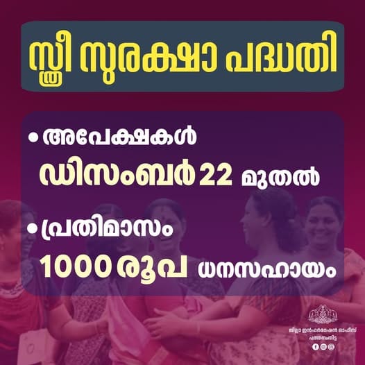 തിരുവനന്തപുരം: സംസ്ഥാനത്തെ സ്ത്രീകളുടെ ക്ഷേമം ഉറപ്പാക്കുന്നതിനായി കേരള സര്‍ക്കാര്‍ ആവിഷ്‌കരിച്ച ‘സ്ത്രീ സുരക്ഷാ പദ്ധതി’യുടെ അപേക്ഷകള്‍ ഡിസംബര്‍ 22 മുതല്‍ സ്വീകരിച്ചു തുടങ്ങുമെന്ന് തദ്ദേശ സ്വയംഭരണ വകുപ്പ് പ്രിന്‍സിപ്പല്‍ ഡയറക്ടര്‍ അറിയിച്ചു. നിലവില്‍ സംസ്ഥാനത്തെ മറ്റ് സാമൂഹികക്ഷേമ പദ്ധതികളുടെയോ പെന്‍ഷനുകളുടെയോ ഗുണഭോക്താക്കള്‍ അല്ലാത്ത അര്‍ഹരായ സ്ത്രീകള്‍ക്ക് പ്രതിമാസം 1000 രൂപ ധനസഹായം ലഭ്യമാക്കുന്നതാണ് ഈ പദ്ധതി. സാെമൃ.േഹഴെസലൃമഹമ.ഴീ്.ശി എന്ന വെബ്‌സൈറ്റ് മുഖേന തദ്ദേശ സ്വയംഭരണ സ്ഥാപനങ്ങളിലെ സെക്രട്ടറിമാര്‍ക്കാണ് അപേക്ഷകള്‍ സമര്‍പ്പിക്കേണ്ടത്.